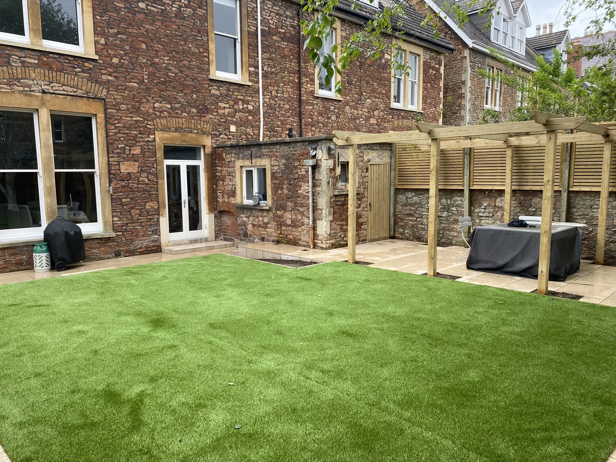 Artificial lawn & landscaped garden with fencing ClientKate & AliYear2021Garden designed byHegarty webber garden designsBriefTo transform non-functioning rear garden into a low maintenance entertaining open space with porcelain patio and pergola for hot tub.
